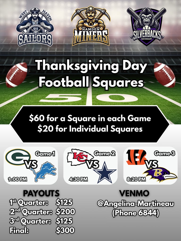 The West Haven Sailors, Hamden Miners, and Waterbury Silverbacks are teaming up for a holiday fundraiser, and you can get in on the action during the 3 NFL games on Thanksgiving Day!